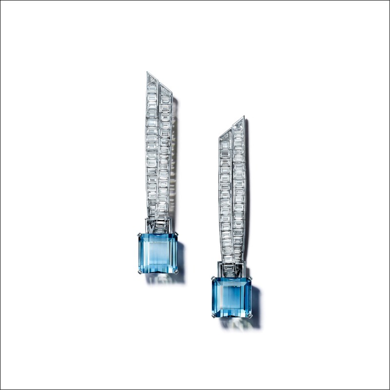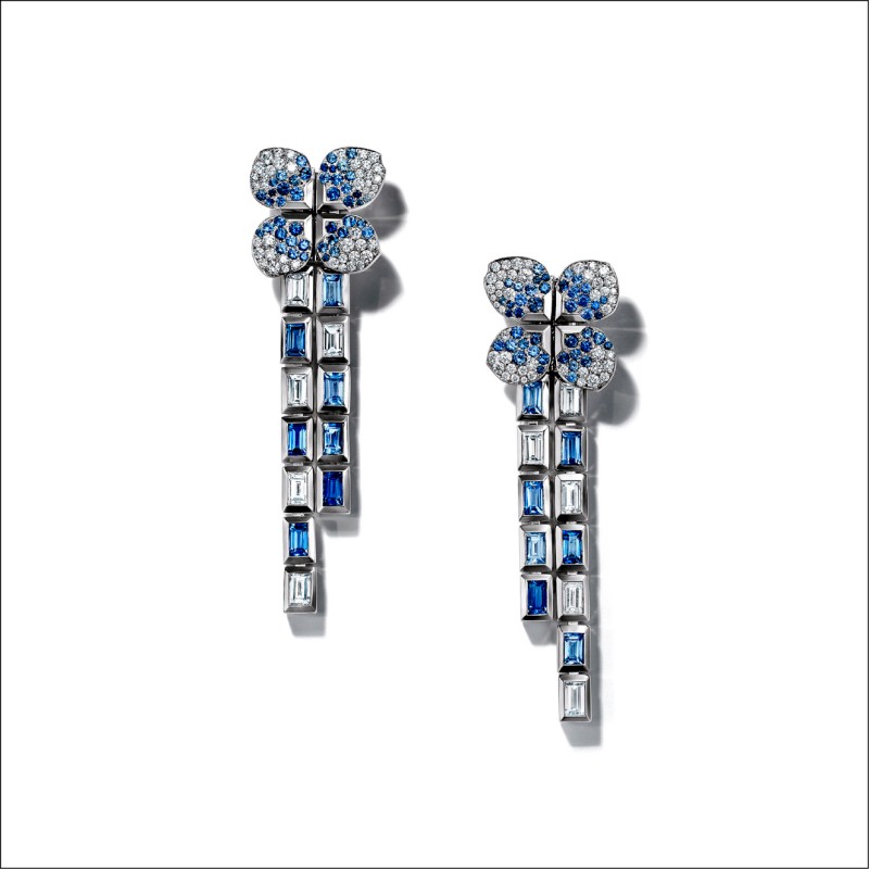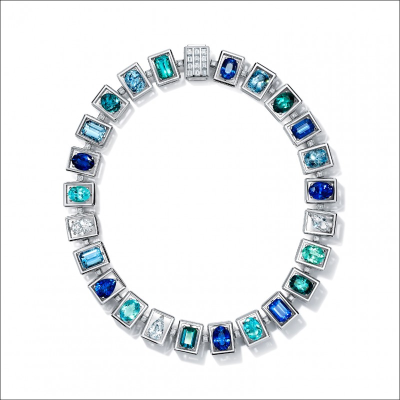 「Frame」主題以充滿幾何感的矩形或方形鑲台突顯寶石特色,框型設計讓寶石宛若漂浮於精心建構的界限之內,例如鉑金項鍊共鑲嵌藍寶石、銅鋰碧璽、藍碧璽、海水藍寶,每一顆寶石的切割形狀各異,在框內自成主角、串聯組合又能相得益彰;「Flora」主題是Tiffany最擅長的花卉,利用顛覆傳統的方式呈現超現實花朵,色彩漸層的訂製切割藍寶石與鑽石化為輕柔花瓣散落,搭配幾何線條,更能呈現花朵的生意盎然。